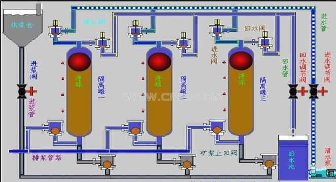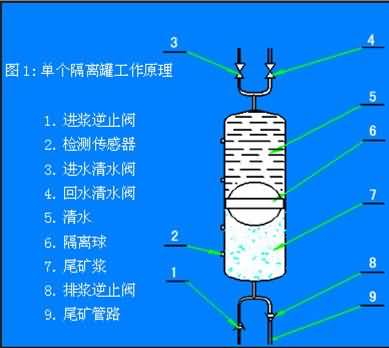 水隔離漿體泵是由高位礦漿池(濃縮池或喂料泵)向隔離罐中浮球下部喂礦漿,再用清水泵向浮球上部供高壓清水,再通過浮球?qū)毫鬟f給礦漿,并把礦漿推到外管線輸送到指定地點。由微機控制的液壓站驅(qū)動六臺清水閥,使三個隔離罐交替排漿、喂?jié){,實現(xiàn)均勻穩(wěn)定輸送。通過傳感器反饋的信號,微機對系統(tǒng)進行實時監(jiān)控,并由故障診斷專家系統(tǒng)對故障進行分析、判斷,再通過可視化系統(tǒng)提示給操作者。該產(chǎn)品的總體思路與原理具有創(chuàng)新性。它利用高效率、長壽命的離心式清水泵作動力源采用巧妙的隔離裝置——浮球,把工作介質(zhì)(清水)與被傳輸介質(zhì)(礦漿)隔離開。隔離裝置即將清水動力傳遞給漿體,還將離心泵的旋轉(zhuǎn)運動方式轉(zhuǎn)變成了容積泵的往復(fù)運動方式。使本產(chǎn)品兼具離心泵流量大,往復(fù)泵揚程高的雙重特點。