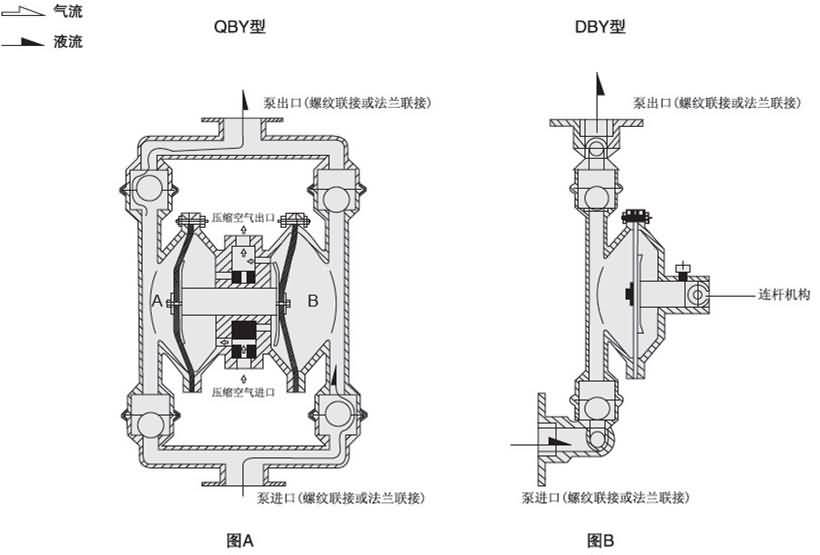 ? 2、在泵的兩個對稱工作腔中,各裝有一塊有彈性的隔膜,聯桿將兩塊隔膜結成一體,壓縮空氣從泵的進氣接頭進入配氣閥后,推動兩個工作腔內的隔膜,驅使聯桿聯接的兩塊隔膜同步運動。與此同時,另一工作腔中的氣體則從隔膜的背后排出泵外。一旦到達行程終點。配氣機構則自動地將壓縮空氣引入另一個工作腔,推動隔膜朝相反方向運動,這樣就形成了兩個隔膜的同步往復運動。每個工作腔中設置有兩個單向球閥,隔膜的往復運動,造成工作腔內容積的改變,迫使兩個單向球閥交替地開啟和關閉,從而將液體連續地吸入和排出。