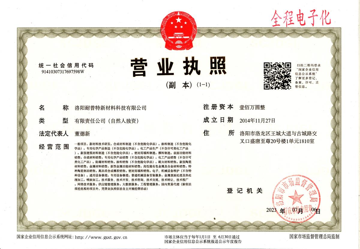 洛陽耐普特新材料科技有限公司www.scgy.com.cn資質證書。