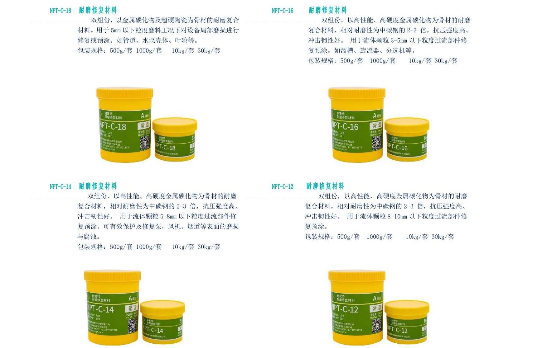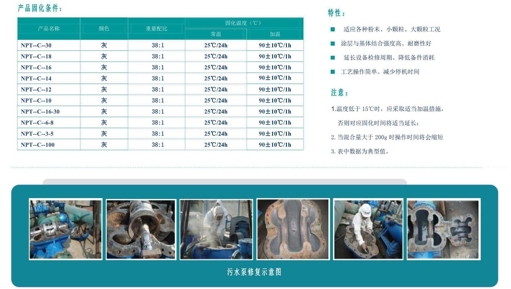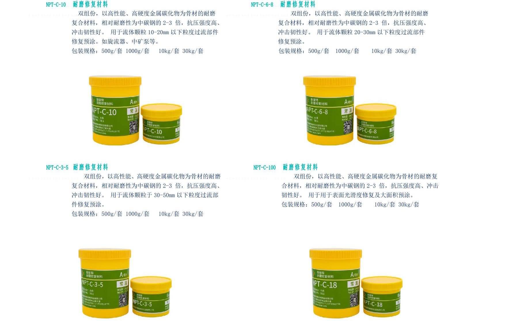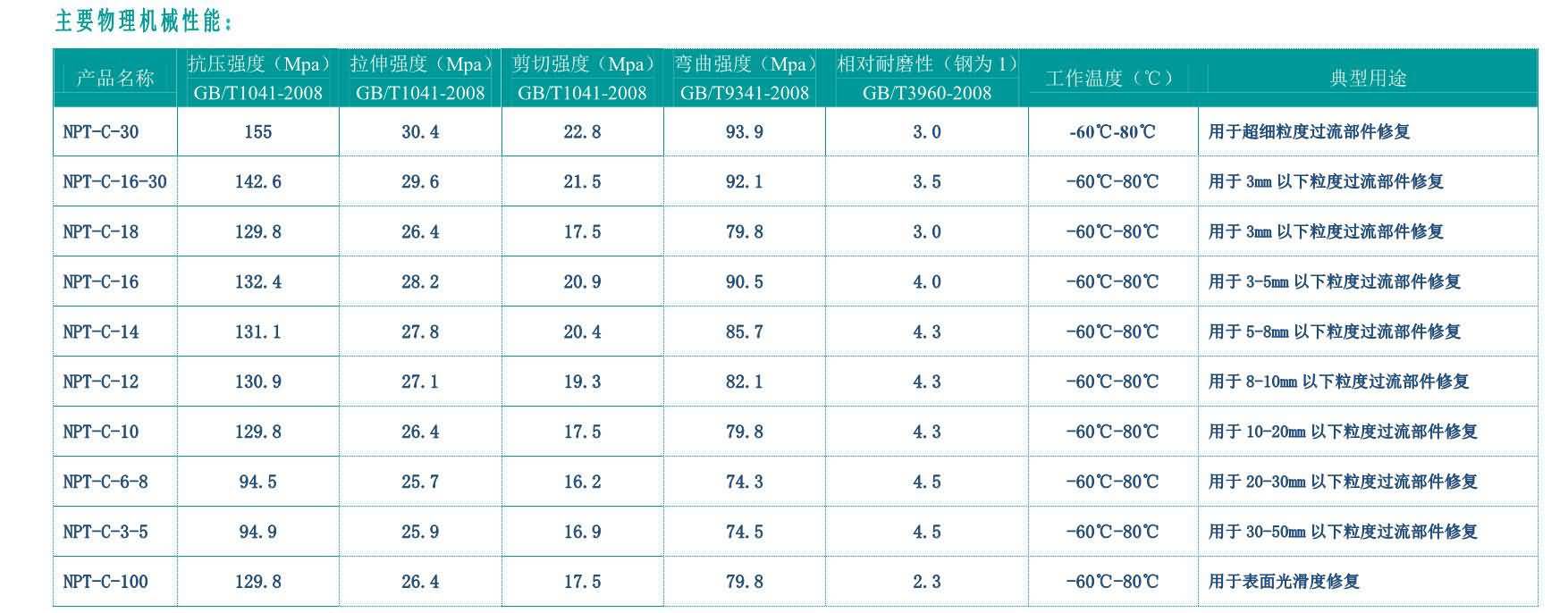 雙組分,以陶瓷、金屬碳化物、微型顆粒為骨材的耐磨復合材料,具有耐水、耐油、耐酸堿性。適用于(工作溫度在-60℃~80℃)設備過流沖蝕、設備的大面積修復、設備預涂耐磨層,如旋流器、浮選柱、浮選機、泡沫槽、分級機、攪拌桶、溜槽、管件類、泵類等修復(典型用途見主要物理機械性能表)。