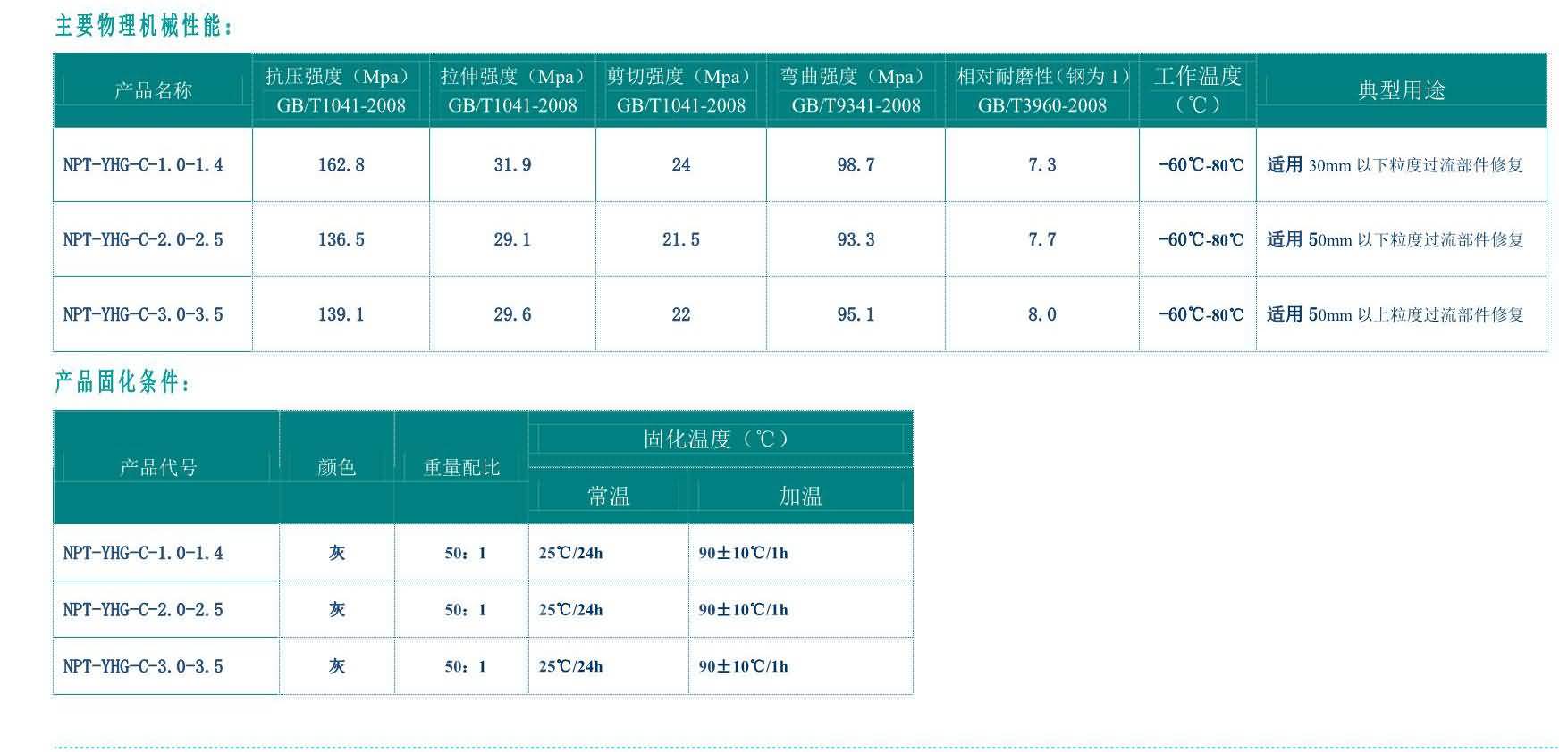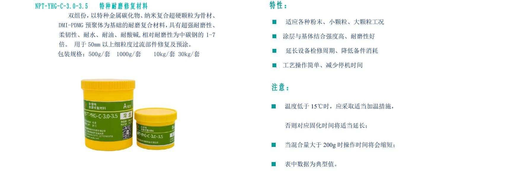 雙組分,以陶瓷、金屬碳化物、微型顆粒為骨材的耐磨復合材料,具有耐水、耐油、耐酸堿性。適用(-60℃-250℃)設備過流沖蝕、設備的大面積修復、設備預涂耐磨層,如旋流器、浮選柱、浮選機、泡沫槽、分級機、攪拌桶、溜槽、管件類、泵類等修復(典型用途見主要物理機械性能表)。